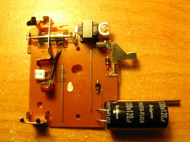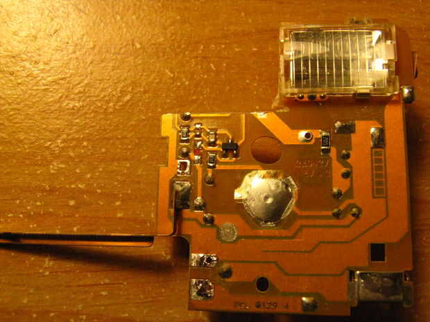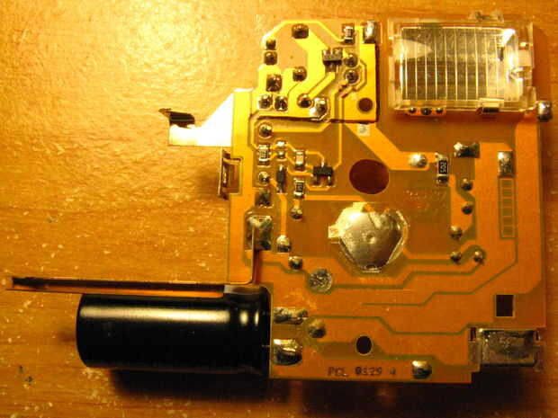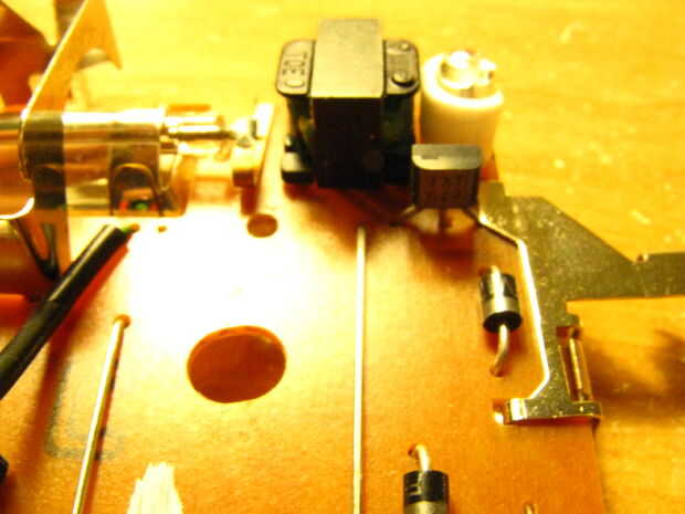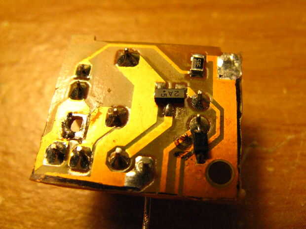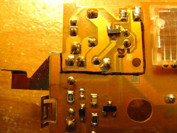 Una vez que has soldado el diodo en, el pequeño condensador y sus contactos a vcc y que el cobre que se encuentra entre los dos transistores de la soldadura.