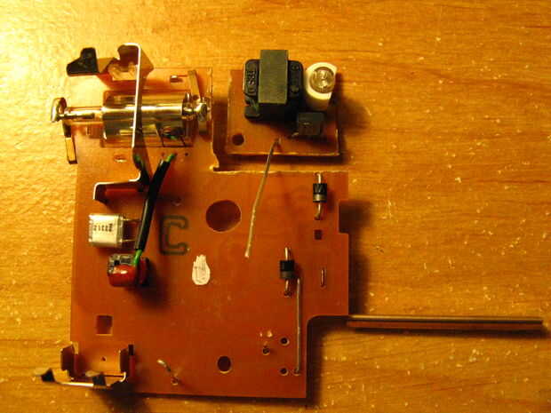 A continuación, cortar el área cúbica transformador asegurándose de que ya han eliminado otras perturbaciones de la forma. Rayar un poco de esmalte de cobre en el extremo de salida de conexión para el tubo del xenón (imagen 3 con D1) si está utilizando el diodo SMD.