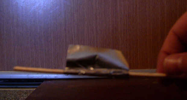 tomar 1 stick de fósforo sin cabeza y ponerlo en el extremo de la lata foil.there debería ser suficiente espacio para poder meter otro partido más adelante en el tubo después de poner 2 coincidir con in.while cabezas rodando, insertar el palo de otro partido en el otro lado por lo que cuando enciende el humo viene hacia fuera el otro extremo del canon