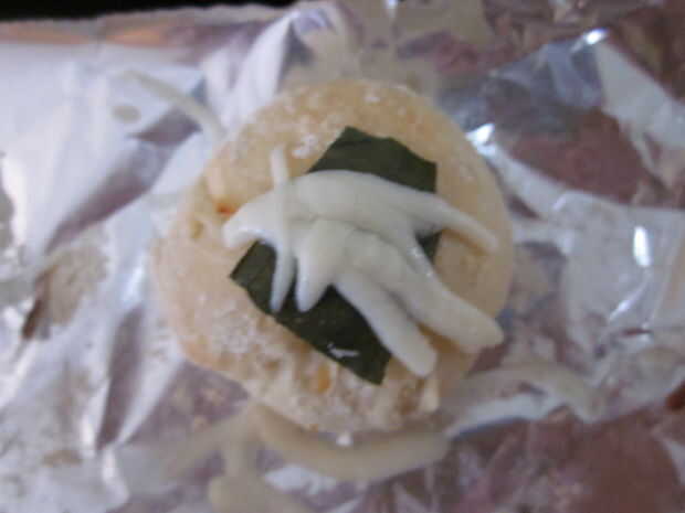 Después de esto, no apague el horno!  Rápidamente (pero con cuidado!) Retire la bandeja del horno y poner un trozo de albahaca sobre cada calzone. Espolvorear el queso sobre ellos y ponerse de nuevo en el horno durante 2 minutos.