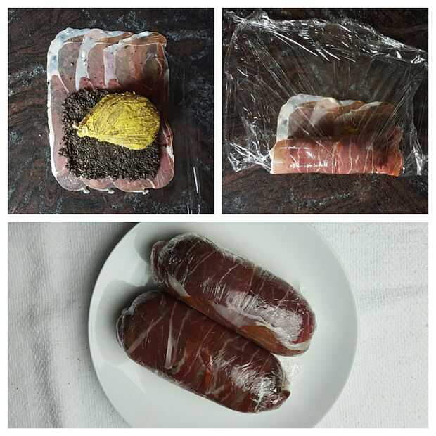Coloque la carne sobre el jamón cubiertos de hongos. Con el film transparente, rollo la Parma jamón sobre la carne, rollo y lazo del film transparente para obtener un registro agradable, uniformemente grueso. Luego enfriar en la nevera durante al menos 20 minutos.