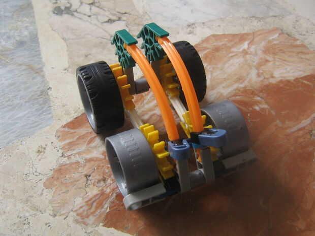 aquí hay unas fotos de mi carro mini K'nex. Hice esto hace unos 8 años. Sólo un rodillo recto pero su mirar. Funciones inversa campana flip con v8 motor sobresale, arrastre grande/ala del alerón, asientos y palanca de cambios, escape trasero doble y