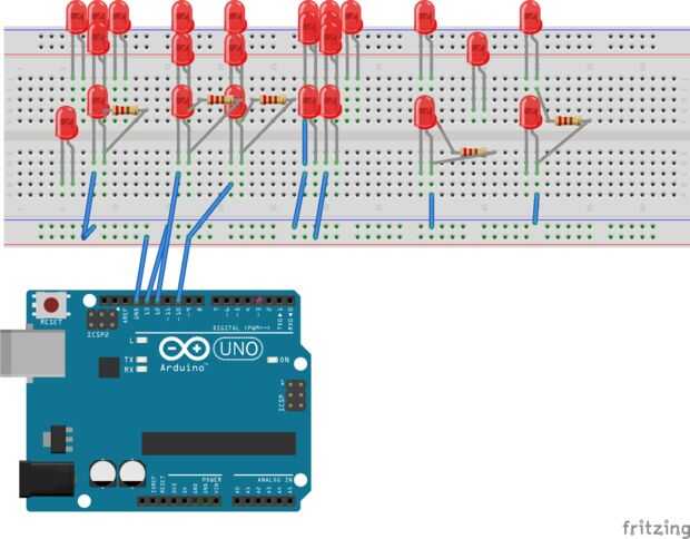 1. Este paso será necesario conectar los LEDs a la Junta. Conectar en forma de cartas.