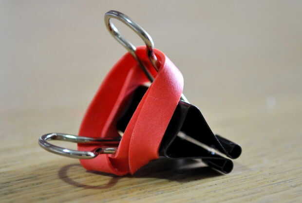 envolver la cinta de goma alrededor de las asas de la pinza de bulldog. doble sobre if tu banda es largo.