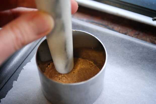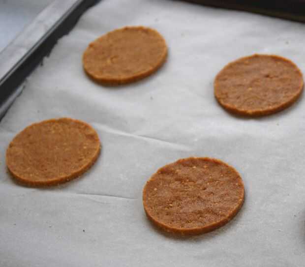 • Áspero dividir la mezcla en 4 y darle forma rondas en una bandeja forrada con papel de hornear presionando firmemente en un molde de aro o un cortador de galletas redondo. (Imagen 3)