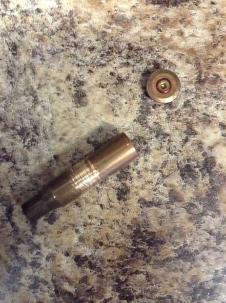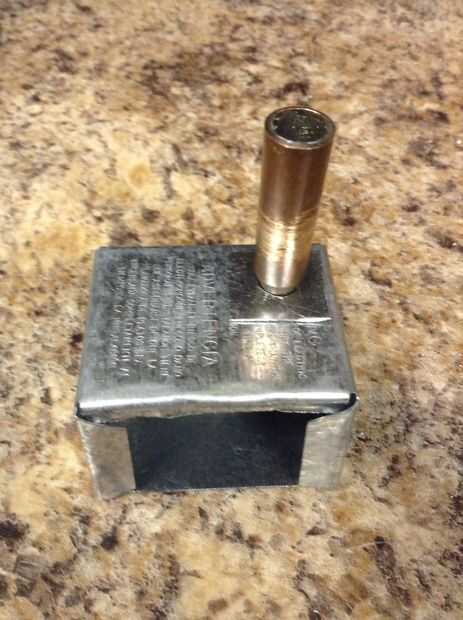 Corte la parte inferior de la cáscara de la bala. Luego perfore un agujero en la parte superior de su chimenea e Inserte el extremo pequeño de la cáscara de la bala. Debe ser lo suficientemente apretada como para quedarse. Usted se estará preguntando por qué hay una plaza pequeña de metal en la mía que es porque no hago bastante apretada y tuve que arreglarlo.