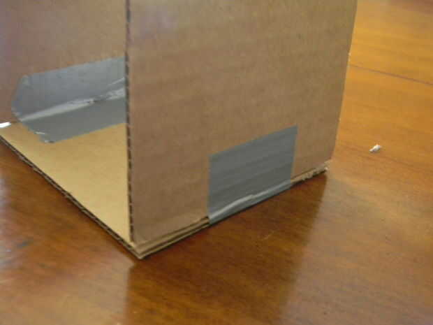 Tomar las piezas de cartón y escoger dos que son más cuadrados. Estas piezas serán superior e inferior del cubo. Luego tomar a pedazos y con cinta adhesiva a la parte superior de la base (para que la pieza es sobre la base, no al lado). Aplique la cinta gris horizontalmente para unir las piezas. Hacer esto con dos piezas en paralelo entre sí. Luego agrega una tira corta en el exterior va verticalmente. Asegúrese de no arrugarse la cinta.