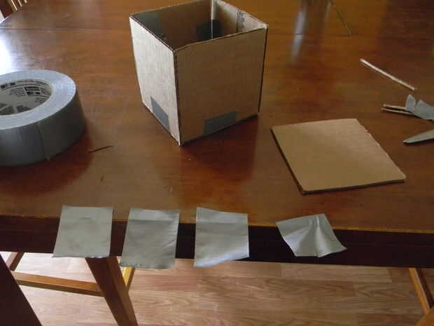 Coloque la última pieza de cartón sobre la caja. Luego cortar cuatro trozos de cinta gris alrededor de 2 pulgadas de largo y colocarlas verticalmente sobre cada lado de la pieza superior. Ahora termine de construir el cubo maravilloso.