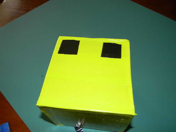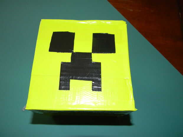 Ahora vamos crear la cara de la enredadera poderosa. Si desea hacer una Baba en su lugar, vaya al paso siguiente. Si desea incluso podría hacer ambos. En primer lugar, cortar dos de 3 x 3 centímetros de cinta negra para los ojos y en el lado mejor aspecto del cubo. Luego, corte un pedazo de cinta de 5 centímetros de largos y cortadas como la imagen de abajo se muestra. Poner la boca debajo de los ojos y asegúrese de que las esquinas superiores de la boca tocan las esquinas más bajas de los ojos. Utilizar la imagen de una cara de creeper para referencia. También he incluido una simple pintura de cómo cortar la boca. ¡ Felicidades! Usted ahora ha completado cabeza Minecraft Creeper! Si desea hacer una Baba, así, continuar al siguiente paso, pero no se olvide de poner la cara en el lado opuesto a la cabeza de la enredadera. Publicar una foto tuya en los comentarios y quisiera saber cómo resultó!