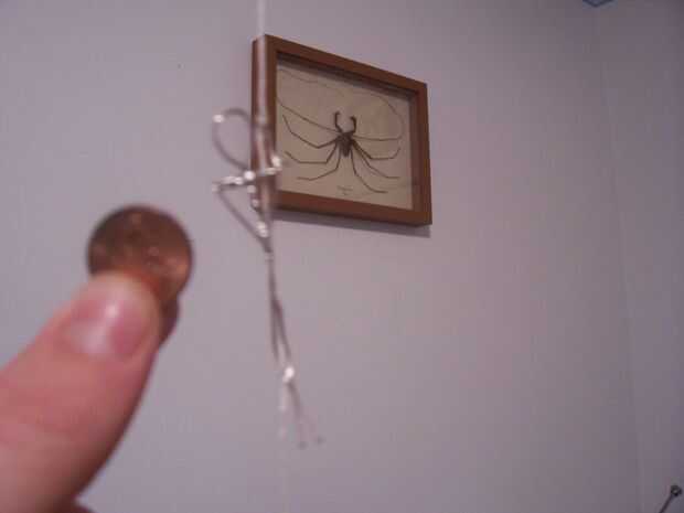 divertirse ahora hice un poco muy fuerte lidiar gancho (pondrá un instructable para el gancho de la garra si recibo comentarios pidiéndome que) y él está colgando de mi centavo de ventilación de aire para escala y sí que es una araña en el redondo trasero es tan grande como mi cabeza tengo muchas más cosas de creppy que colgar en mis paredes oh y el tipo de clip de papel es un espía ahora