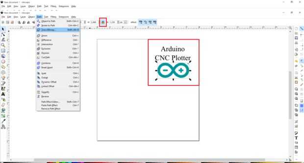 Esto es más difícil que los textos. Imágenes deberán tener un fondo transparente. Arrastrar y soltar la imagen del logotipo de arduino (descarga de archivos) en Inkscape. Haga clic en aceptar en la ventana siguiente. Ahora tienes que redimensionar la imagen al tamaño de nuestra área de impresión, vea la imagen 4. Haga clic en ruta de menú y "Trazar mapa de bits".