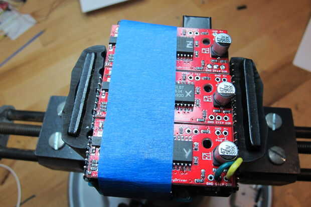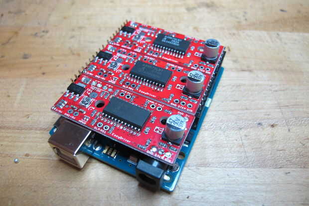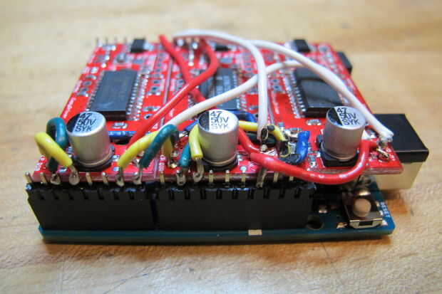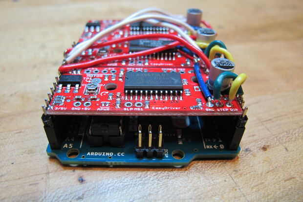 Descubrí que apila tres fácil controladores paso a paso Motor encima de la ONU puede ser una manera eficaz de ahorrar algo de espacio. El cableado se realizó con alambre trenzado y algo de paciencia. Usé un poco de cinta aislante en el conector hembra USB en la ONU para evitar cortocircuitos en cualquier rastro de circuito en la parte inferior de la tercer controlador de Motor de paso a paso fácil.