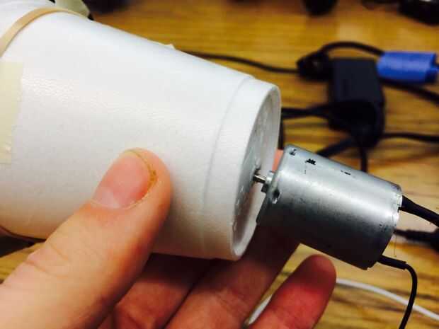Usted necesitará una manera de conectar el motor a las ruedas. Después de probar muchos métodos se determinó esta forma de trabajar mejor. Para este paso, debe conectar el eje del motor a la taza de plástico (Asegúrese de que está conectado directamente) con pegamento caliente. El punto real de esto sin embargo fue sólo para servir como una conexión al motor, si usted tiene una manera diferente de conectar lo dos entonces todos mejor. Probamos usando un eje de correa de goma anterior sin embargo nos enfrentamos a problemas de conexión.