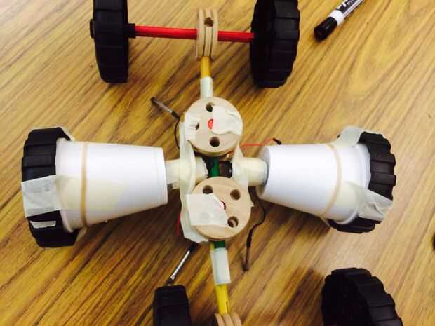 Instale sus ruedas y sus motores en el medio del chasis para completar su coche. Debe tener los cables van de los dos motores a la batería. En nuestro coche la batería era demasiado pesada, por lo que llevó a cabo mientras nuestro coche funcionó, sin embargo, si el automóvil se construye un poco diferente entonces puede sostener el peso. Un inconveniente de nuestro diseño es que no se mueve muy rápido y no pudo soportar el peso de las baterías. este tema fue debido al método de cómo estamos conectados los motores a las ruedas. mejor la conexión mejor la movilidad del vehículo.