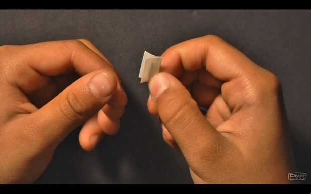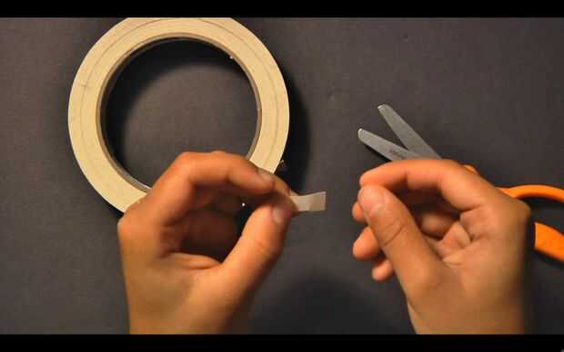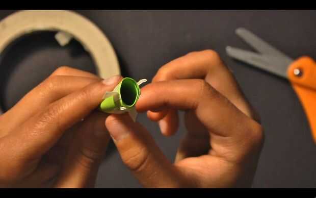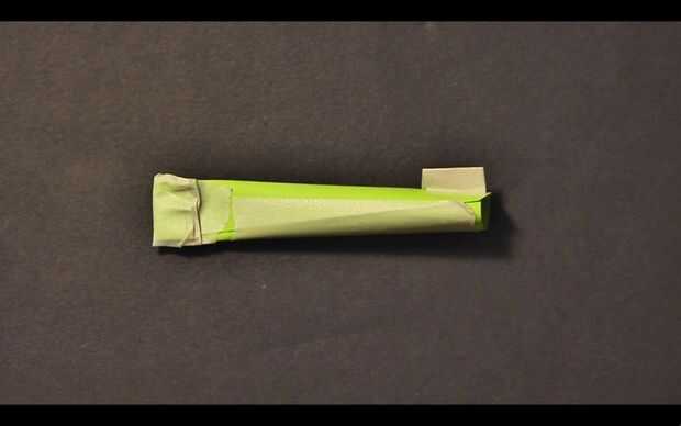 Para hacer una aleta, cortar un pequeño trozo de cinta, de aproximadamente 1/4-1/3 de pulgada. Doblar en la mitad, lado pegajoso en el medio, comenzando en el centro de la pieza. DEJAR LAS PUNTAS DE DESPEGUE. Pegar la aleta al otro extremo del rollo de papel. Repita el procedimiento para hacer las aletas más 2-3. Asegúrese de que espaciar hacia fuera uniformemente alrededor del borde inferior del rollo.