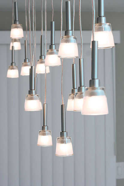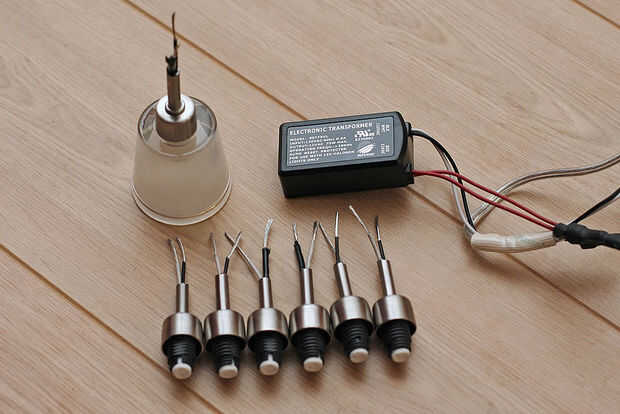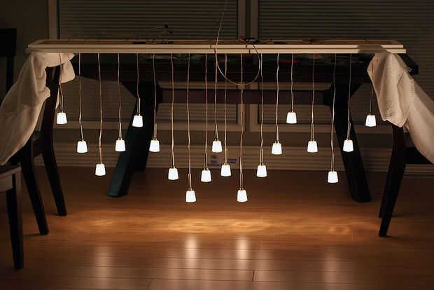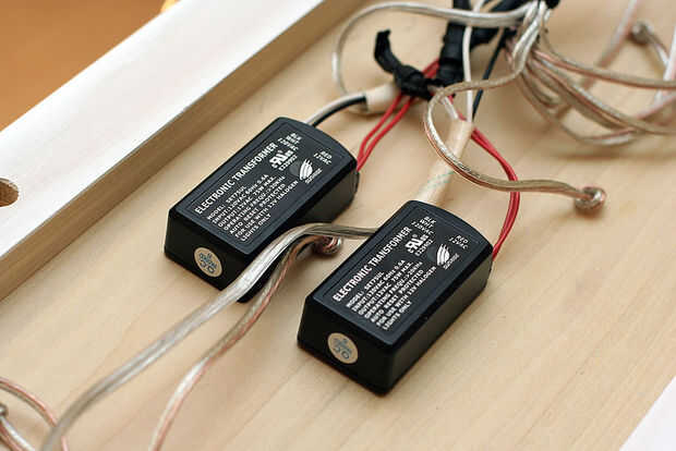 me gusta mucho el look de lámparas colgantes mini. Más luces, el mejor! Mi visión era arreglar unos 20 de ellos en una línea, esparcida en un patrón semi orgánico. Que necesitaba construir un montaje y encontrar una manera para convertir el voltaje a 12 voltios para alimentar las lámparas de 10 Watts. No soy mucho de un electricista, y estaba tratando de mantener el proyecto alrededor de $300, así que pensé que era mejor para cannabilize varios existentes de baja tensión, Lámparas colgantes mini. IKEA me enganchó para arriba con tres lámparas KRYSSBO que vinieron con alguna bonita, colgantes de cristal, bombillas y transformadores necesarios. Cogí un carrete de cable de altavoz, algo de madera, y lo estaba.