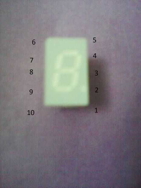 La mini pantalla LED es un LED de cátodo común visualización 7-segmento y su distribución de pines se muestra en el imagen adjunta en este paso cuya numeración forma una inversa "U" de 1 a 10 pin de este componente.
