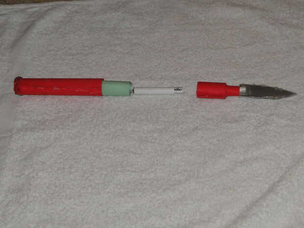 Hey, chicos. Se trata de un cuchillo balístico fácil de PVC que hice recientemente. Yo no diciéndote cómo hacerlo, que es un secreto, pero usted podría ser capaz de hacer de las imágenes. Utiliza un resorte de la válvula de trompeta en la foto de la