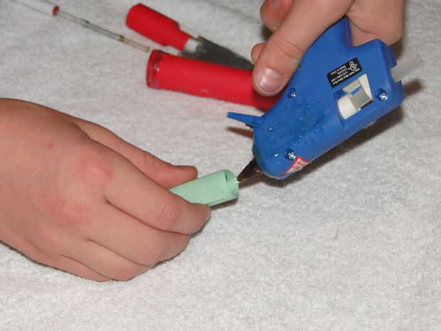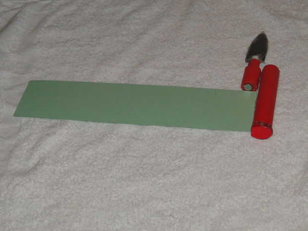 -Cortar una hoja de papel aproximadamente de 2 y 1/4 pulgadas de ancho. -Envuélvalo alrededor de los manantiales, así los resortes de caber comodamente en él, pero pueden todavía mover arriba y abajo en su interior y pegamento. -Pegamento en el mini cuchillo balístico base.