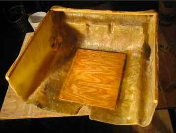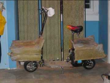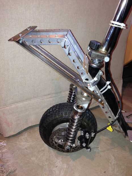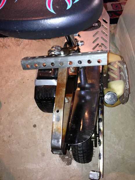 Puedes ver las fotos de los dos últimos como sección I fiberglassed en la parte delantera y trasera una pequeña hoja de madera contrachapada para proporcionar un lugar más firme para las secciones del perno a sus respectivos soportes sobre el scooter.