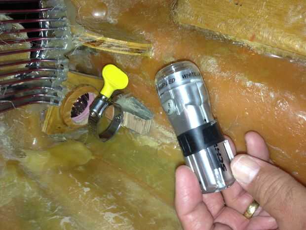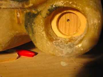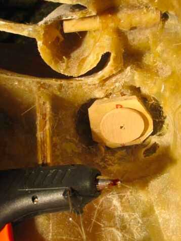 Las dos primeras fotos ilustran cómo utilicé una pistola de pegamento caliente para instalar algunos discos de madera contrachapada para pequeño, célula, lámparas LED para el primer desfile. Pronto determiné que el baratos bombillas LED compré no iba a ser lo suficientemente bueno. Me terminé comprando dos de alta intensidad, LED linternas bicicleta para proyectores. Las fotos restantes muestran cómo taladró agujeros en la madera que se adaptan perfectamente a las linternas. También solía J-B Kwik parte 2 epoxy montaje bloques de madera en la parte inferior de la campana, detrás de los agujeros de faros. Usé estos bloques de madera para montar abrazaderas de tipo dominante, así que pude sostener que las linternas firmemente, sin embargo, fácilmente eliminarlos cuando quiero cambiar las pilas. Envuelve una pequeña tira de goma alrededor de la linterna, donde alinea con las abrazaderas de tipo dominante. El faro monta trabajo maravillosamente.