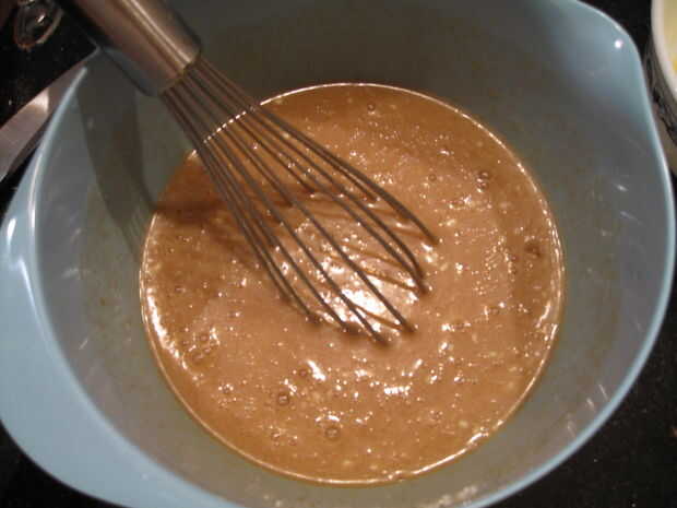 En un recipiente aparte, batir los huevos, azúcar, azúcar morena, mantequilla, aceite, jugo de naranja, ralladura de naranja y extracto de vainilla.