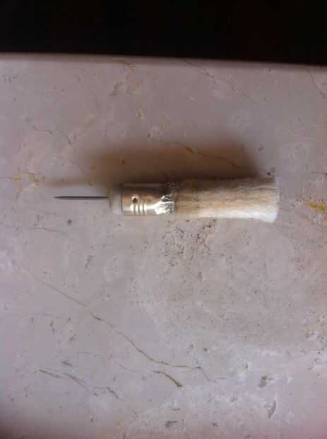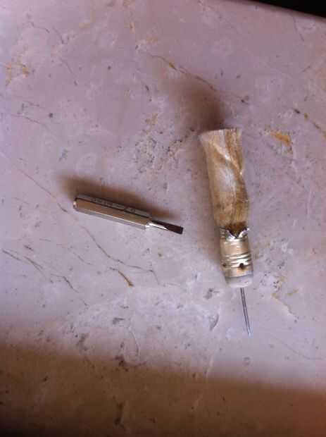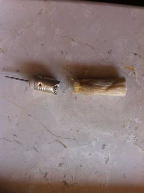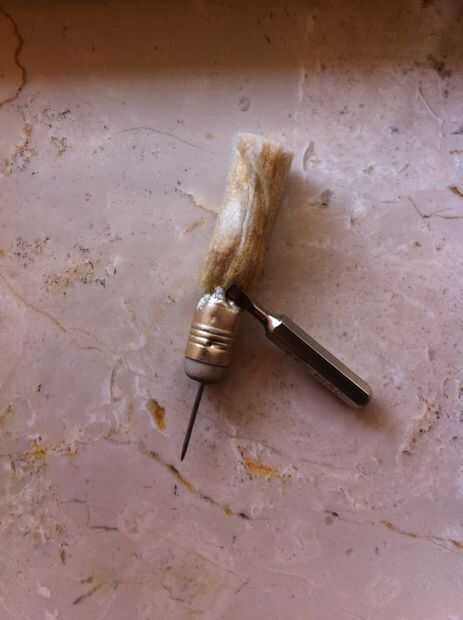Para la cola necesita una colilla que ha quitado de su cubierta de papel de la Peña. Poner en el extremo posterior de la goma de borrar como se muestra arriba. Fijarlo a la goma de borrar presionando los bordes para fijar en el trasero. Usaba una pequeña cabeza plana pero hará cualquier cosa con un punto.