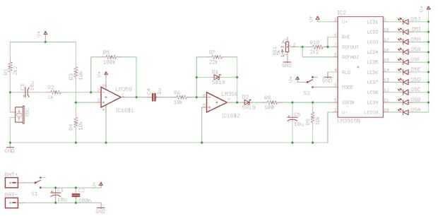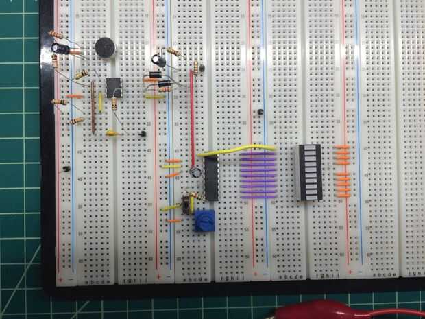 Una vez que estaba trabajando, puse el micrófono y el canal dual op-amp en y empezó a jugar con varios valores de resistencia y el condensador hasta que el micrófono proporciona una señal de que los LEDs de la misma manera.