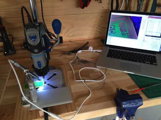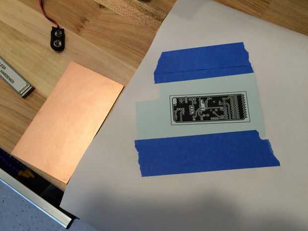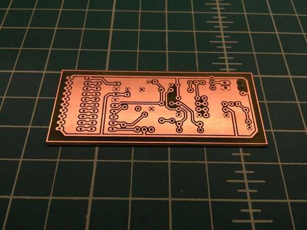 Hace un año que escribí un post GeekDad detallando mi proceso para la fabricación de placas de circuito en casa, pero básicamente me imprimir el diseño del águila en Pulsar Pro FXPapel de transferencia de Toner y luego de laminado directamente en una placa de cobre normal. Grabar la Junta frotando con una esponja empapada en cloruro férrico para uno o dos minutos, inmersión en líquido de la lata durante un minuto o dos, luego perfore todos los agujeros pequeños con una prensa del taladro Dremel.