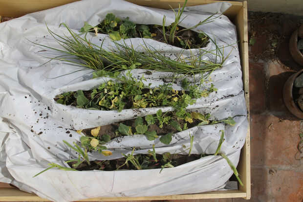 Planta sus semillas solicitadas o comprar algunas semillas y plantarlas directamente en el recipiente. Aquí he plantado 5 diferentes verduras y hierbas, puede probar con muchas verduras diferentes y crecen plantas que no necesitan más suelo para crecer, como la papa, aunque también se podría hacer este recipiente mayor e incluso papas.