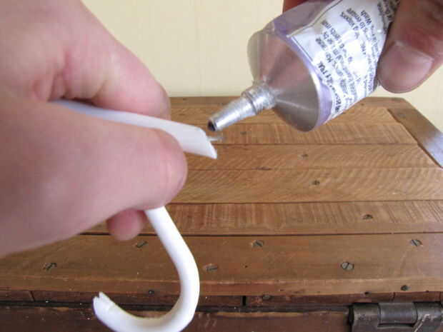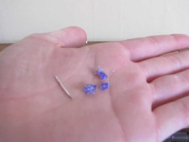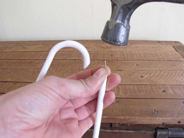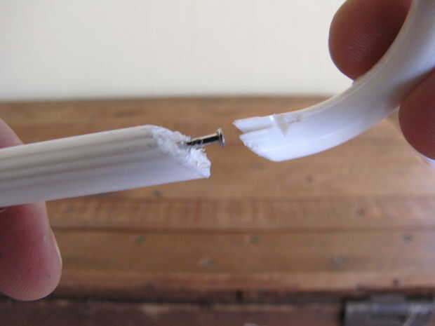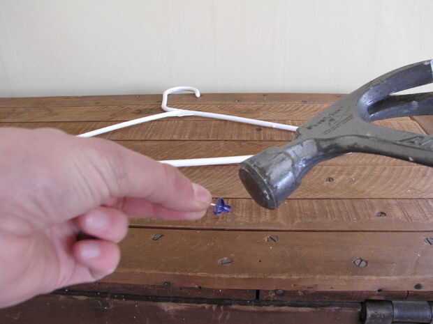 Una vez que la tachuela, usted martilla en la pieza inferior largo de suspensión que ha cortado abierto. Suena bastante simple de explicar, pero un poco complicado cuando se trata de porque es un plástico y se tambalea cuando usted martilla. Pero por suerte, el plástico es bastante suave por lo que entra fácil si tienes el resto de la percha sólidamente algunos cómo. Utilicé mis pies y rodillas para mantenerla constante y entonces sólo golpeaban la pieza bordada.