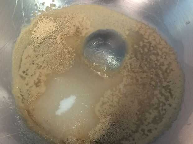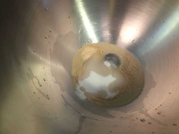 Mezcla el agua, el azúcar y la levadura a la derecha en el recipiente que usará para la masa.