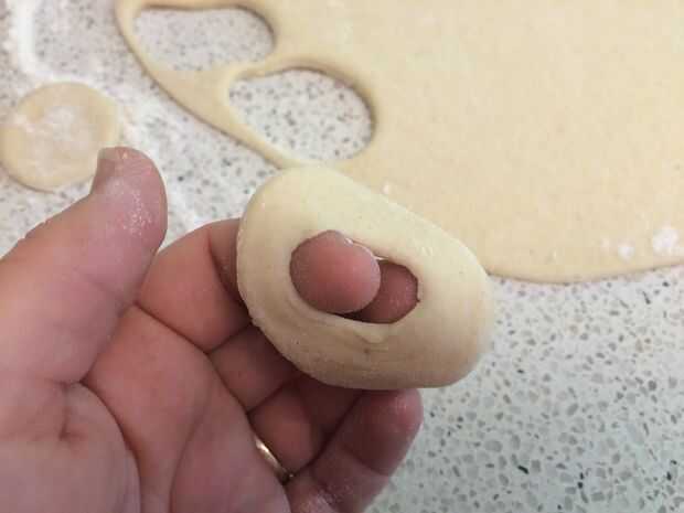 Usando un vaso de chupito o potito o algo similar de tamaño, recorta tus círculos, luego usando tu dedos hacen un poco del agujero en el centro. Me pareció más fácil hacer un ramo como este antes de empezar friendo, porque una vez empiezas a freír que tienes que mantener tu atención en eso.