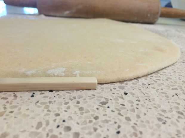 Harina ligeramente su espacio de trabajo. Tomar la mitad o 1/3 de la masa y rodar hacia fuera. Que lo que rodé sobre el grueso de los palillos. Sería aproximadamente 1/4 de pulgada. Yo diría que podría hacer un poco más gruesa pero no más de 1/2 pulgada de espesor.