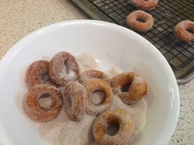 Después de que sale el aceite y sentado sobre una toalla durante un minuto, lanzarlas alrededor en el azúcar de canela. Luego colóquelas en una charola o bandeja. Pero theres no mucho ya costumbre largo pasado!