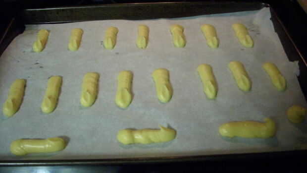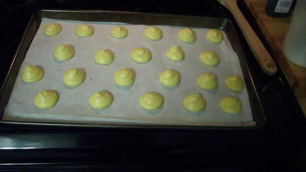 Si está usando una cuchara, siga las mismas directrices para rectas, alternas las filas. No serán en forma religiosa, sean bombas de crema. O si desea aún utilizar un nombre de fantasia, Profiteroles. Si está usando dos cucharas, utiliza el tazón de fuente de agua y sumerja las cucharas en el agua antes de sacar con pala la mezcla. Ayuda a pegarse. Sacar con una cuchara y utilizar el otro para raspar la mezcla hacia abajo y en el pergamino. Volver a sumergir la cuchara.