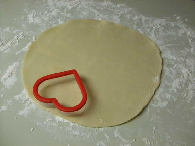 Comience cortando corazones! Corté todos los corazones que necesitaría para hacer más fácil más adelante en vida. Cuando tengas todos los trozos, sólo les aplasta juntos y ruede hacia fuera. Tengo suficiente para 6 empanadas de bolsillo (12 corazones en total) de una tarta.