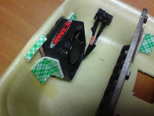 montar el ventilador en la abertura del agujero con la cinta de montaje doblada...