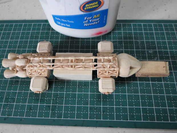 Para completar el águila, tuve que hacer una plantilla especial compuesto por 11 once laminados palos de depresor de lengüeta de tamaño para caber entre el bastidor de soporte. La plantilla apuntala la nave espacial mientras que el pegamento entre el tanque de combustible externo montaje y el espaciador se seca. También tuve que usar otra plantilla para el módulo de comando mientras se seca el vínculo entre el fuselaje frontal y el módulo de comando.