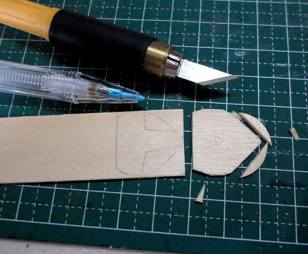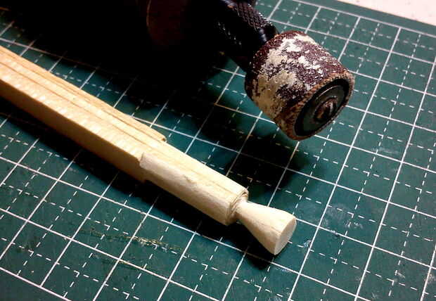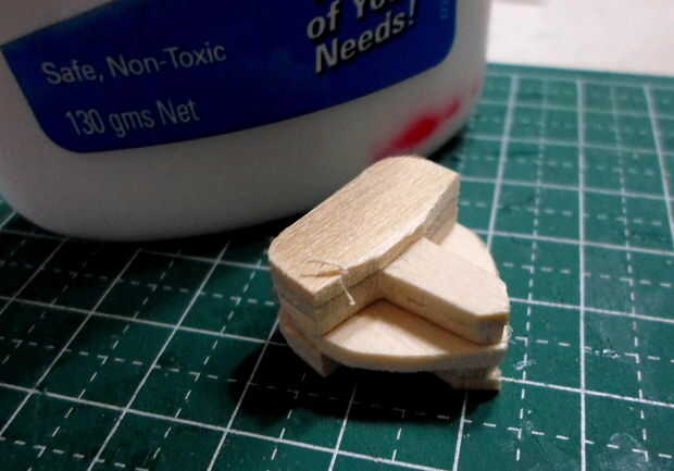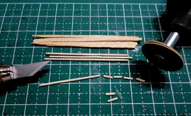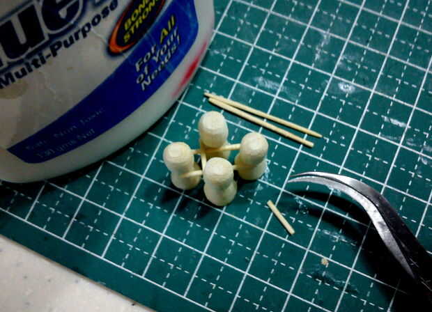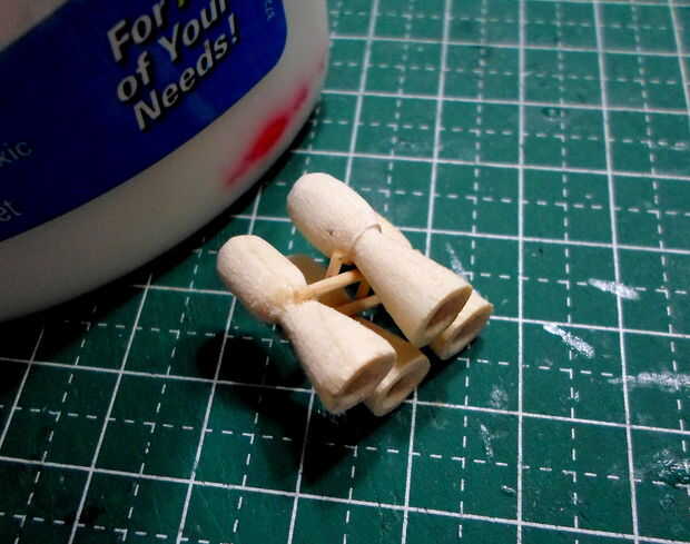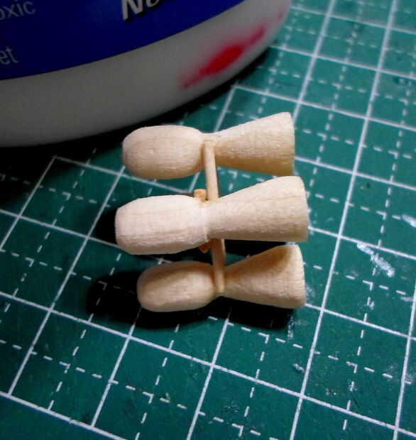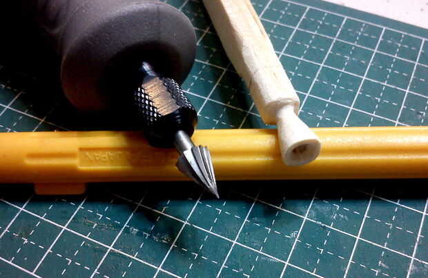 Para los motores principales de cuatro 4 del águila, agitadores del café tamaño regular se intercala juntos. La pieza hojaldrada, sola entonces fue tallada en una pieza en forma de espiga con un accesorio de lijadora de tambor grueso/fino montado en un Dremel 3000. Para tallar el inyector de empuje en forma de cono, un accesorio de lijadora de tambor fino fue fijado en un ángulo y el pasador de madera cuidadosamente girado. Una estación de trabajo Dremel montaje de la herramienta de la moto vino en práctico para ello, libera a ambos de mis manos para girar la clavija de madera.