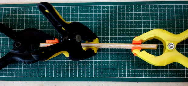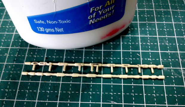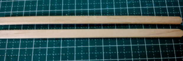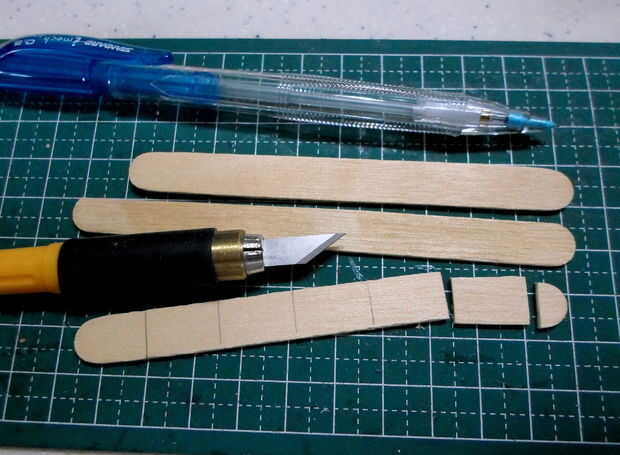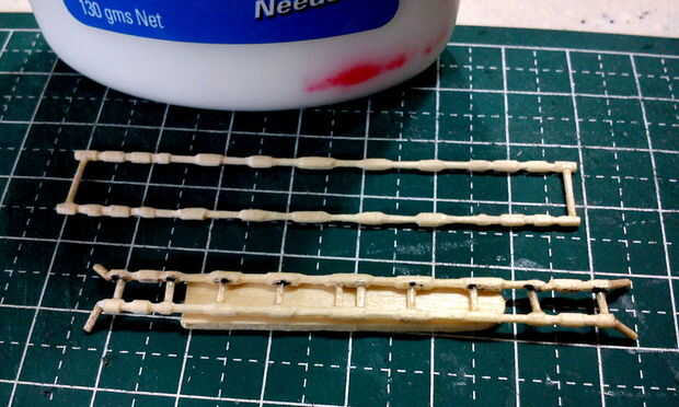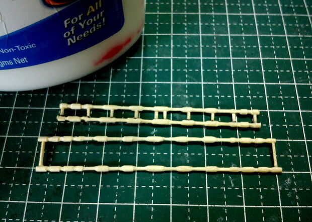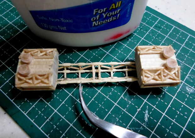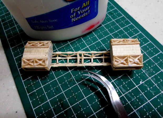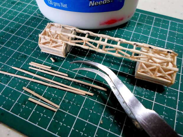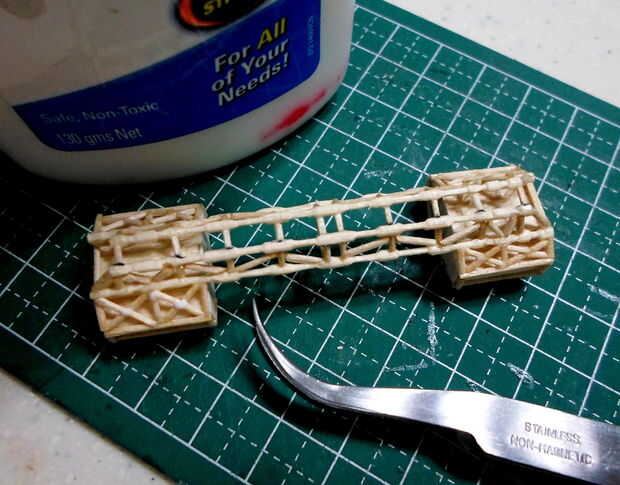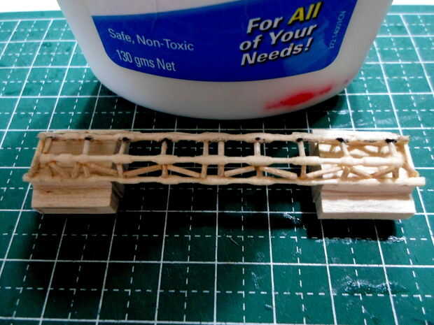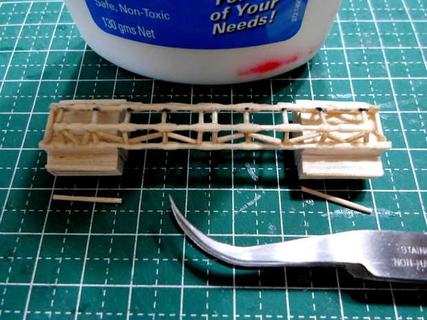 Los puntales de la parte inferior fueron un segmento más largo que el conjunto superior. Dos 2 soportes transversales ya estaban pegados en ambos extremos de las barras de la parte inferior. Toothpicks diluidos se utilizan para unir la parte superior 'escalera' con el puntal de la parte inferior.