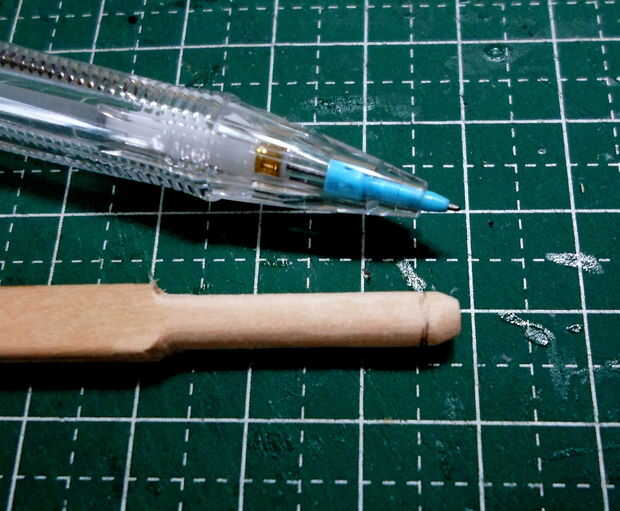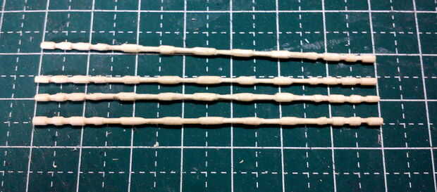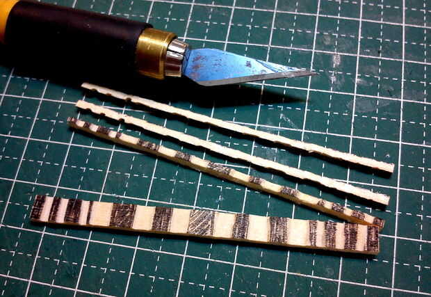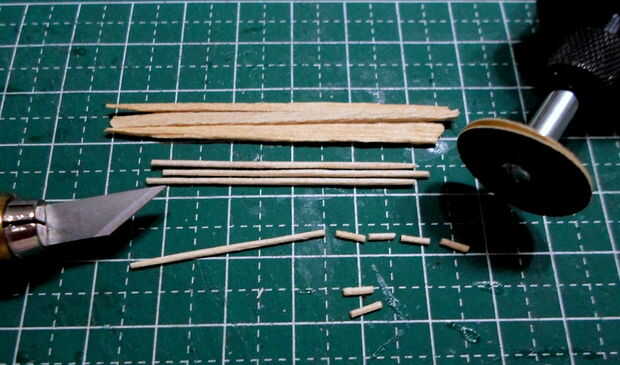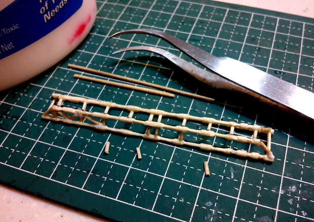 Para los soportes transversales que conecta la parte superior par de puntales, palillos diluidos fueron utilizados. Cada travesaño estuviera pegado a la costilla en el más grueso cruce utilizando los esquemas de la vista superior como referencia. El marco superior terminado ahora debe parecerse a una pequeña 'escalera'.