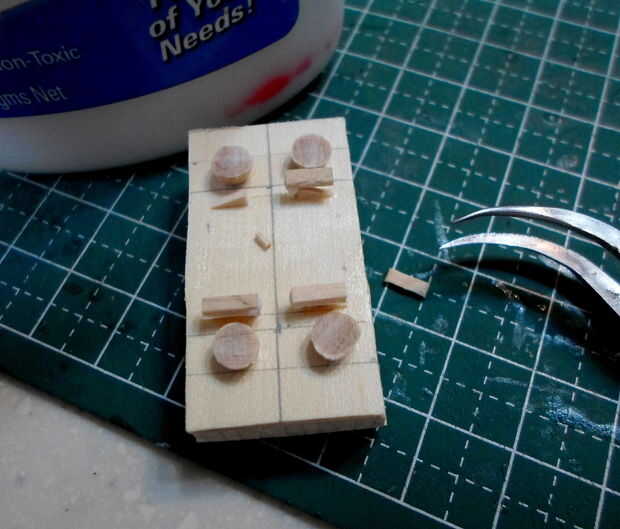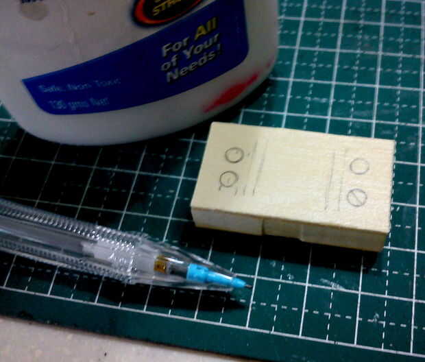 Laminado de una sola pieza de depresor lingual por debajo de la vaina para aumentar la altura como se muestra en los esquemas. Marcas de guía fueron dibujadas para el chorro vertical y cojines del aterrizaje de la cápsula de transporte. 4 cuatro turborreactores vertical (desde el paso anterior) estaban pegados a la parte inferior de la cápsula de transporte. Inicialmente trató de hacer un agujero en cada vertical turborreactor utilizando un accesorio #125 pero decidió abandonar este puesto que la pieza tenía una tendencia a dividir en el medio. Por lo tanto, el modelo representado tiene chorro vertical sólida.