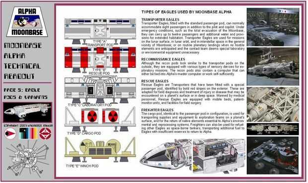 La cápsula de transporte estándar se utiliza para transportar equipo y personal de la base lunar. Una vaina en forma similar, la cápsula de rescate es reconocible por rayas verticales rojo y utilizado para el transporte de salvamento y equipos de rescate.
