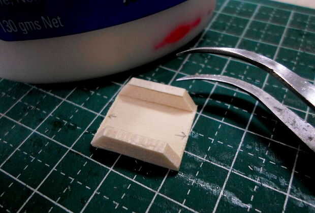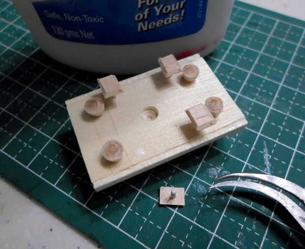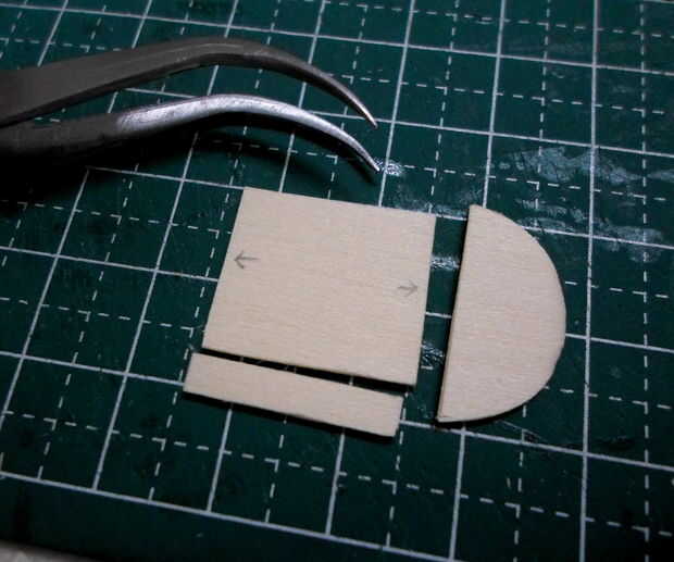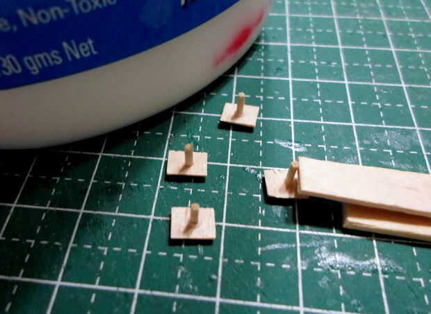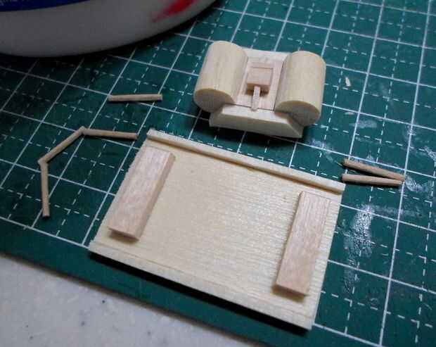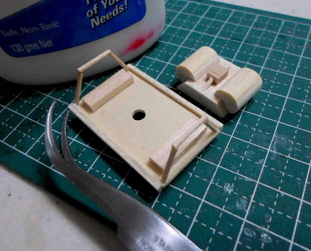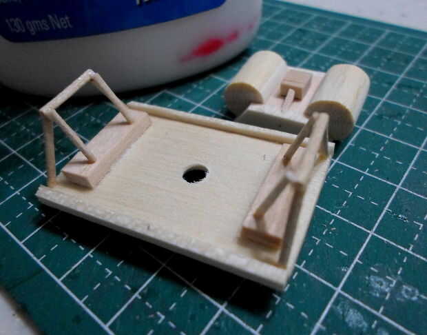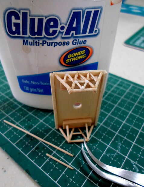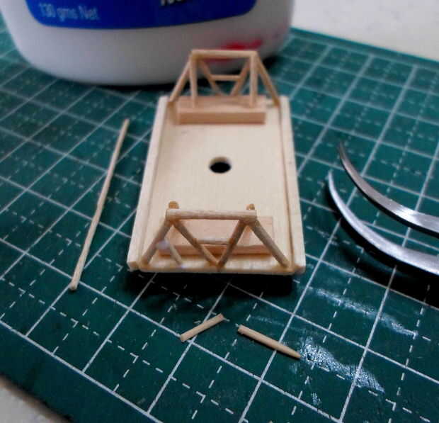 El marco de la plataforma se hizo de semejantemente finos palillos de dientes cortado y pegado en el patrón de las imágenes. Un marco base delimita el marco esquelético a la plataforma de cabrestante. Originalmente planeaba incluir la pinza magnética en este modelo pero pensé que sería inútil mostrar por separado. Un agujero para el cable fue perforado en la plataforma para este propósito.