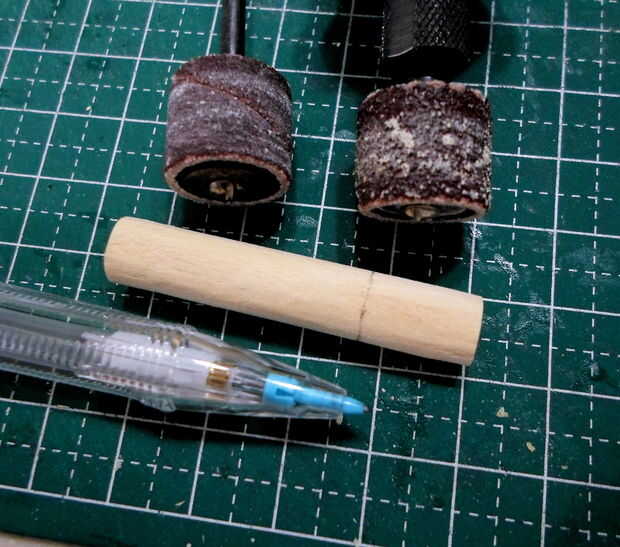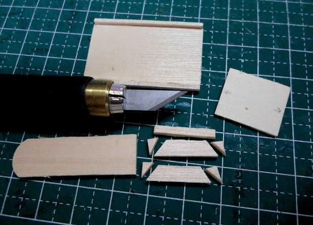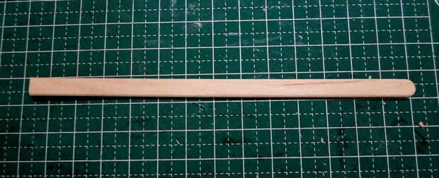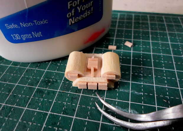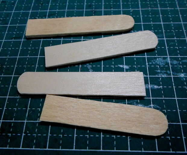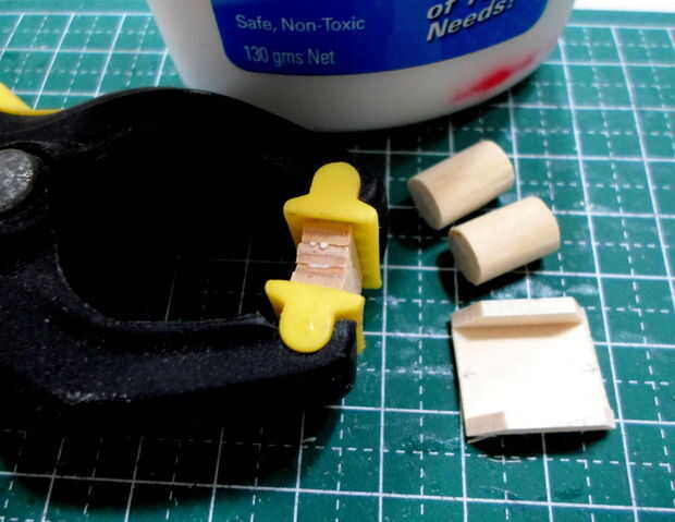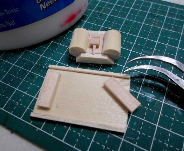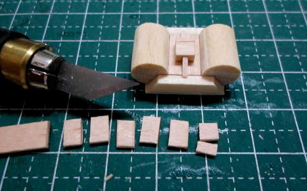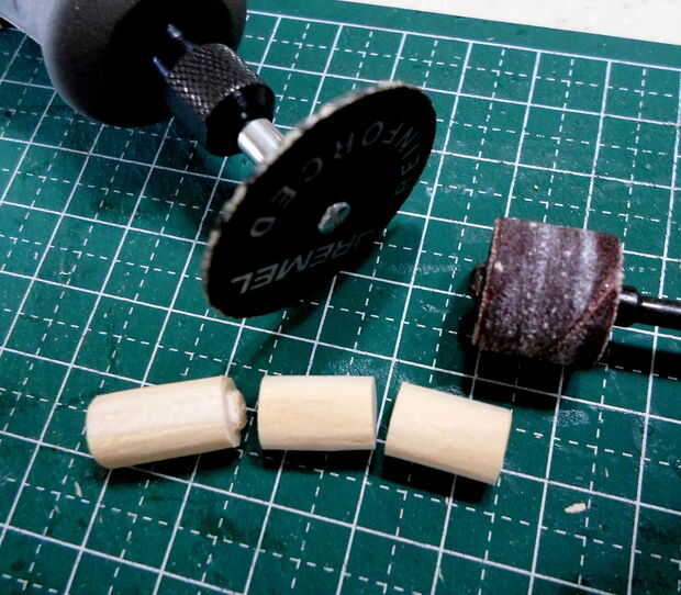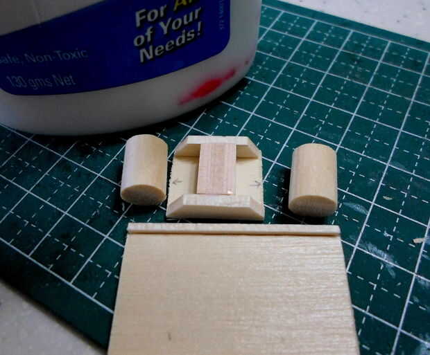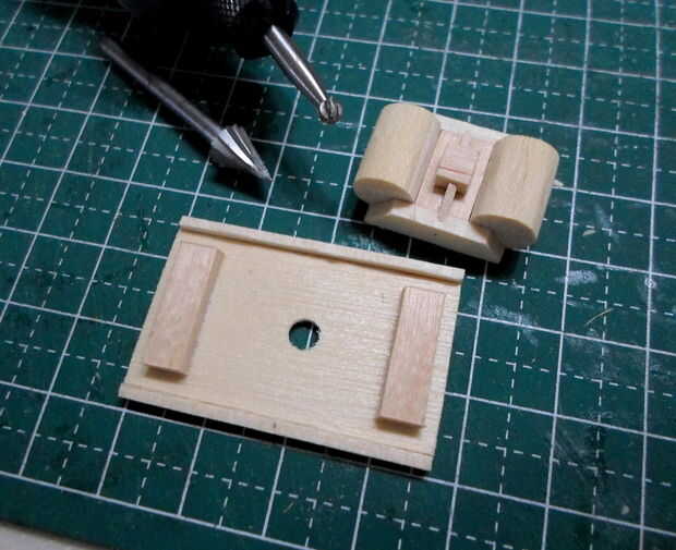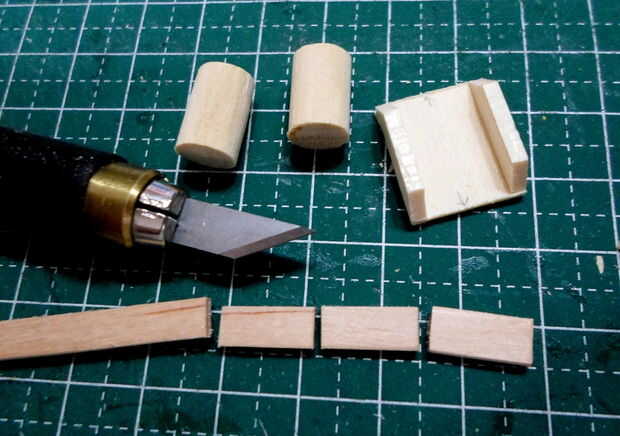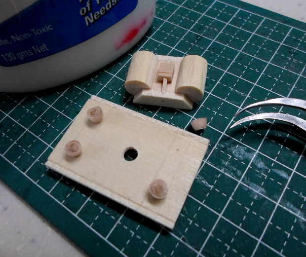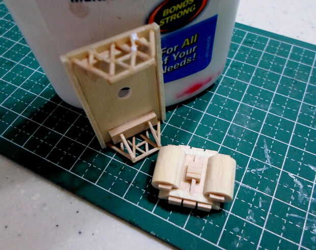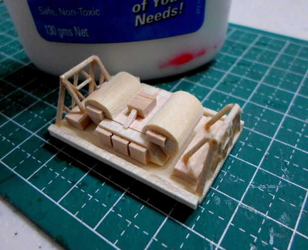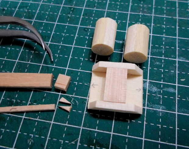 Tornos cilíndricos se hicieron de agitadores del café de madera laminado, grueso formado y cortado a la medida.  El montaje del torno y los detalles eran de partes de la chatarra "caja".
