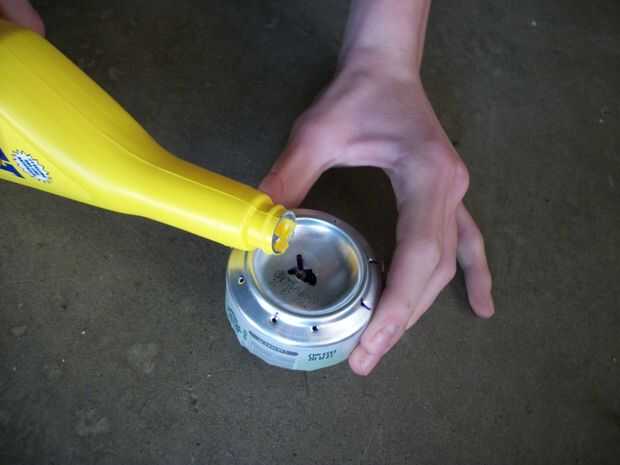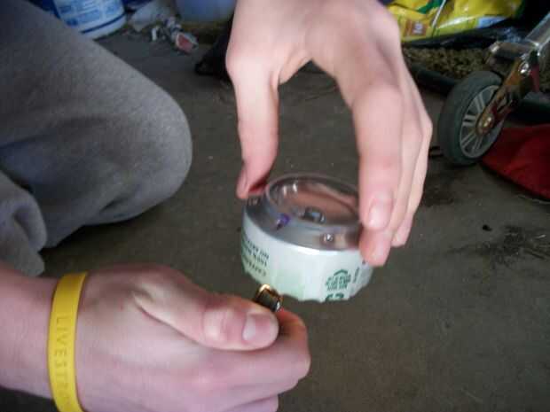a la luz de la estufa tendrá que llenar con relleno de combustible (duh) la estufa con 3 cucharas de mesa de su combustible. Esto debería ser suficiente para hervir una olla de agua. Después de que la estufa se ha llenado, cubra el orificio de combustible con un penique o un tornillo. Después de llenarlo con combustible obtiene un poco más complicado. Para encender la estufa para necesita pre-calentar. Puede hacer esto manteniendo un encendedor bajo la lata durante unos minutos o algunas de su combustible de iluminación en una pequeña bandeja y poner la lata en él durante unos 45 segundos. Una vez que la estufa esté precalentada solo mantenga una llama a uno de los jets y debe encender. Puede que necesite luz cada inyector individualmente.