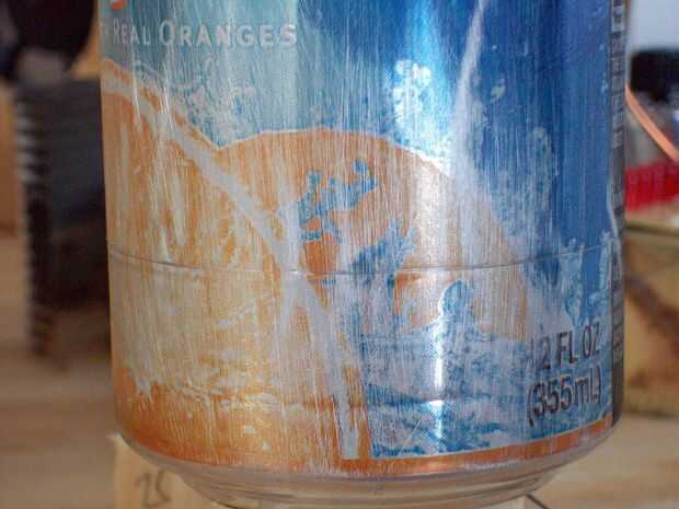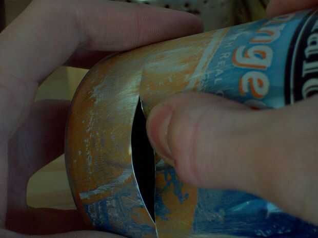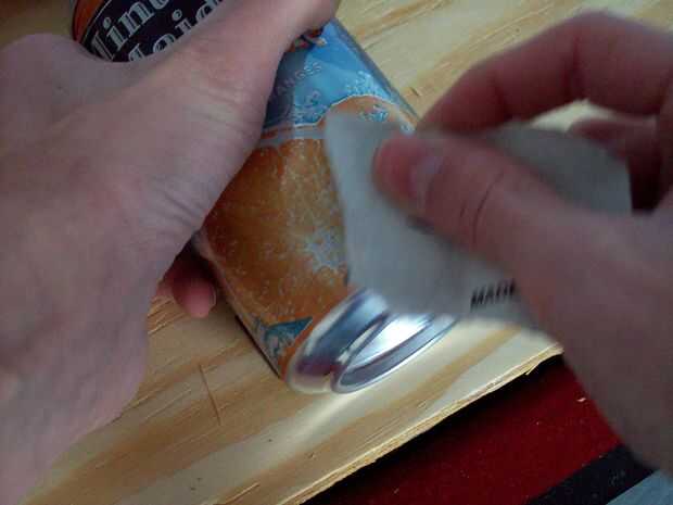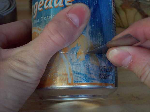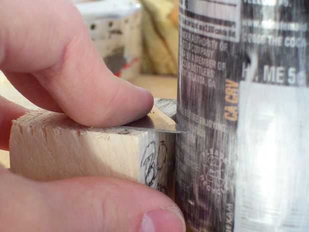 Después de eso, consigue un trozo de madera 30mm y una lámina de cuchillo de utilidad. Poner la lata en una tabla y marque una línea alrededor de la poder un par de veces con la hoja en la pieza de madera. Luego, empuje la cuchilla en el poder en la línea y romper la lata poco a poco a lo largo de la línea. Usted debe obtener un corte perfecto.