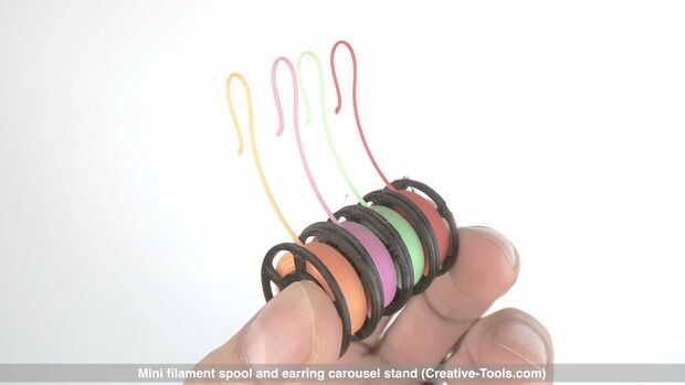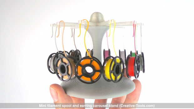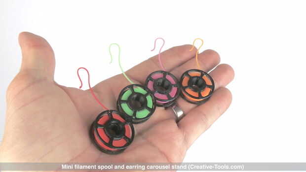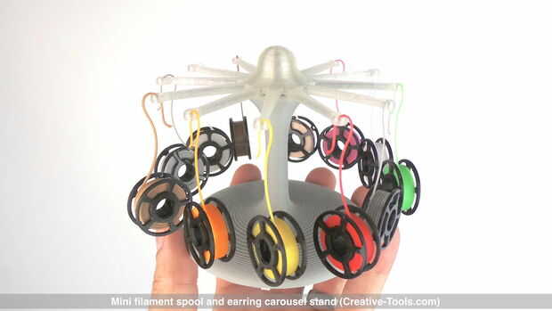 Este diseño para imprimir 3D combina una bobina de filamento de impresora 3D miniatura decorativa y un stand de carrusel de giro para colgar pendientes.