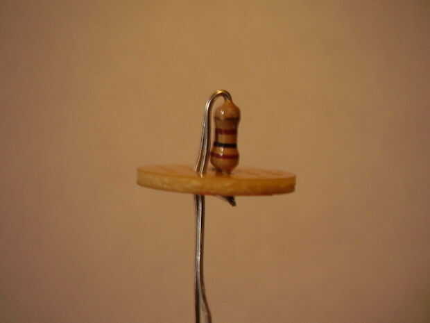 Asegúrese de que las resistencias están en una posición vertical a la placa de circuito y doblan las puntas en la parte inferior de la placa de circuito como se muestra.
